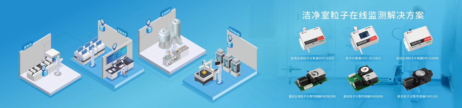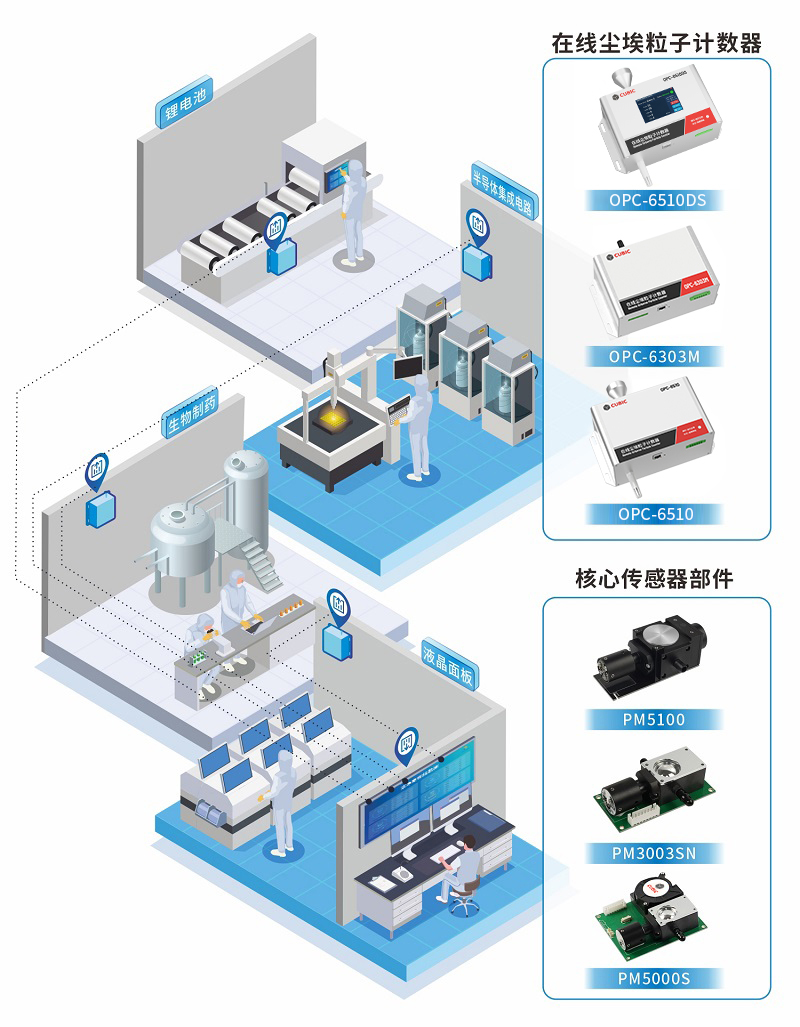 四方光電基于12年光散射技術的研究與創新,推出了在線塵埃粒子計數器OPC-6500F、OPC-6303M和OPC-6510,以及核心零部件激光塵埃粒子計數傳感器PM5000S、PM3003NS和PM5100,可廣泛應用于百級、千級、萬級、十萬級等潔凈室環境。