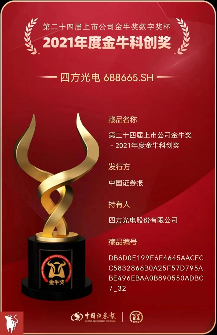 2022年12月29日,中國證券報第二十四屆上市公司金牛獎名單正式揭曉,四方光電股份有限公司(以下簡稱“四方光電”)榮獲2021年度上市公司“金牛科創獎”。