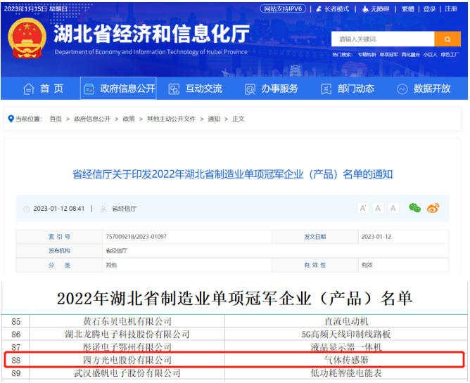 1月12日,湖北省經濟和信息化廳發布《關于印發2022年湖北省制造業單項冠軍企業(產品)名單的通知》,四方光電獲評“2022年湖北省制造業單項冠軍企業”。