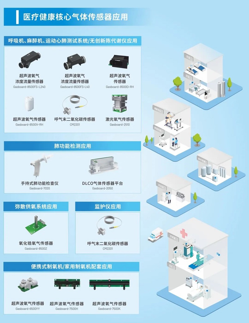 在醫療健康領域,四方光電憑借多年的研發及應用經驗,創新研制了超聲波氧氣傳感器、超聲波氧氣流量計、ETCO2傳感器等產品,這些醫用氣體傳感器具有測量精度高、響應快速等優勢,可滿足醫療領域呼吸測量和麻醉等需求,廣泛應用于各種呼吸機、制氧機、高流量氧療儀、麻醉機和監護儀中。并且基于多年NDIR、電化學和超聲波等氣體檢測技術積累,四方光電可為客戶提供專業的OEM/ODM技術服務,包括多種氣體傳感器和整機的定制化解決方案,滿足醫療技術中氣體測量需求。