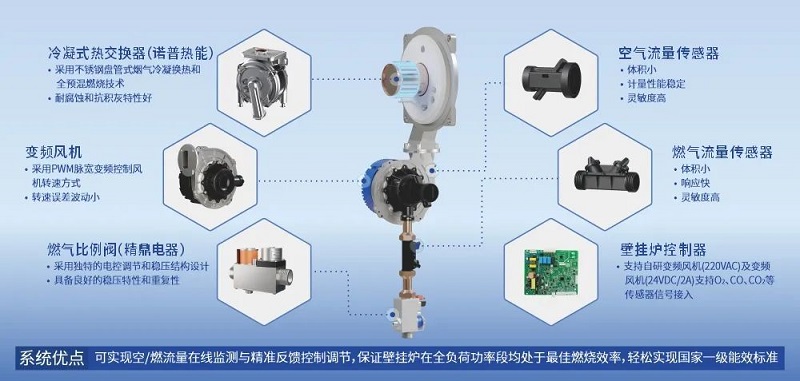 四方光電還推出了ACS智能燃燒系統,集成了其控股子公司的燃氣比例閥(精鼎電器)、冷凝式熱交換器(諾普熱能),與四方光電超聲波燃氣流量傳感器、空氣流量傳感器,配合離子感應電機和高調節比文丘里,可實現空/燃流量在線監測與精準反饋控制調節,保證壁掛爐在全負荷功率段均處于最佳燃燒效率,輕松實現國家一級能效標準和環保要求。