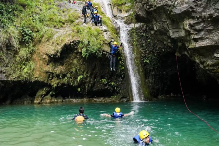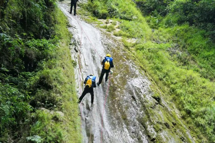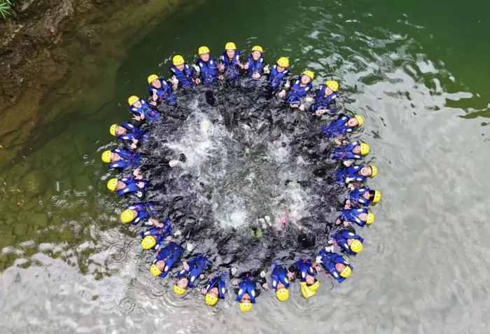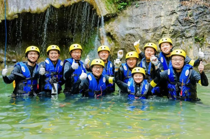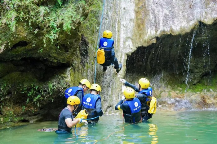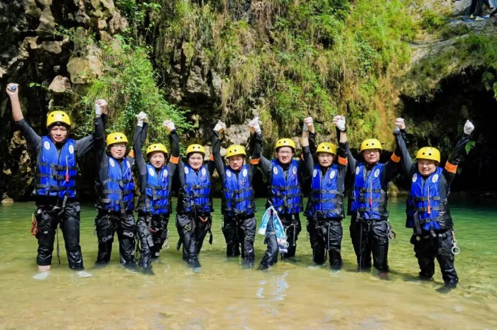 7月12日清晨,6支隊伍再度集結,進行更具挑戰性的戶外項目。在險峻的峽谷之間,參訓隊員完成了近4公里溯溪,以及驚心動魄的10米、40米瀑降,最后是終極挑戰5米跳潭,所有隊員無一人退縮,戰勝恐懼勇敢一躍。在這一天的極限挑戰中,參訓隊員始終把集體榮譽擺在首位,在挑戰中主動擔當、互相鼓勵,不僅圓滿完成任務,更展現出了運營團隊出色的凝聚力、戰斗力和執行力。