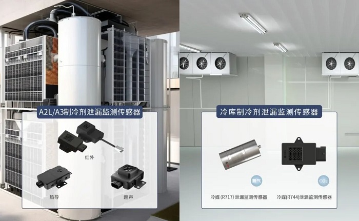 四方光電基于綜合的傳感器技術平臺和技術創新,推出了一系列冷媒泄漏監測傳感器,涵蓋紅外、熱導、超聲三種技術路線,適用于各種A2L/A3冷媒的監測(如R454B、R454C、R1234YF、R1234ZE、R290等)。針對冷庫制冷劑泄漏引發的安全問題,自主研發了冷媒(R717)和冷媒(R744)泄漏監測傳感器,可以精準監測氨氣和二氧化碳氣體泄漏,具有抗干擾性強、檢測精度高、響應快、壽命長等優勢,有效防范爆炸等事故的發生,保障冷庫制冷系統的安全運行。