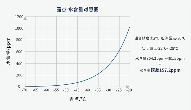 · 實際:露點與水含量呈非線性關系,露點越高,水含量差別越大。鋰電池車間露點通常在-60℃~-30℃,電容式傳感器檢測該區間誤差較大,如檢測露點為-30℃,水含量誤差高達157.2ppm。