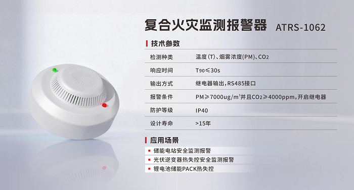 針對電化學儲能電站早期火災監測預警,四方光電推出了ATRS-1062復合火災監測報警器,采用NTC熱敏電阻、光散射、非分光紅外技術,實現對儲能電站熱失控時的溫度、煙霧、CO?濃度指標進行有效監測:
