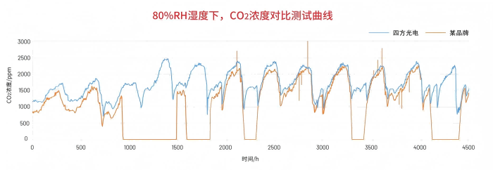 在實驗室80%RH濕度環境中,歷經六個月的CO?動態濃度測試,AM4203H-CO?始終保持穩定運行;而某品牌抗高濕CO2變送器僅在一個月后便出現信號中斷,此后數據頻繁異常。